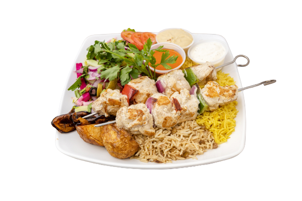 Grilled seasoned chicken breast, served with rice, salad hummus, and garlic sauce.